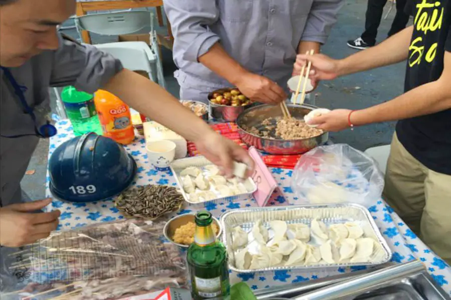 4点30分行政部的同事们早早为大家准备好了丰盛的烧烤食品和饺子皮馅、水果、饮料、啤酒等。在欢声笑语中炊烟袅袅升起,随着公司总经理周德勇高呼:“同事们,干杯!”烧烤晚会正式拉开帷幕。