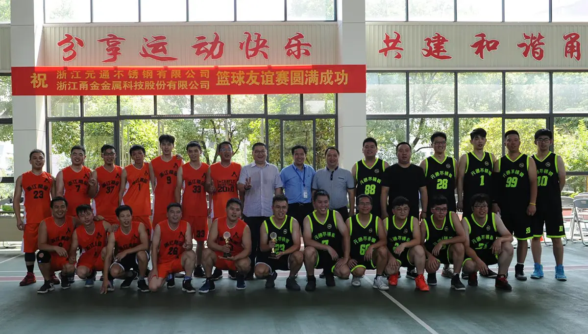 9月20日上午,浙江甬金篮球队与浙江元通不锈钢有限公司篮球队,在我公司体育馆举行了一场篮球友谊赛。浙江甬金金属科技股份有限公司董事长虞纪群和浙江元通不锈钢有限公司董事长郑光良以及双方公司领导到现场观看比赛。